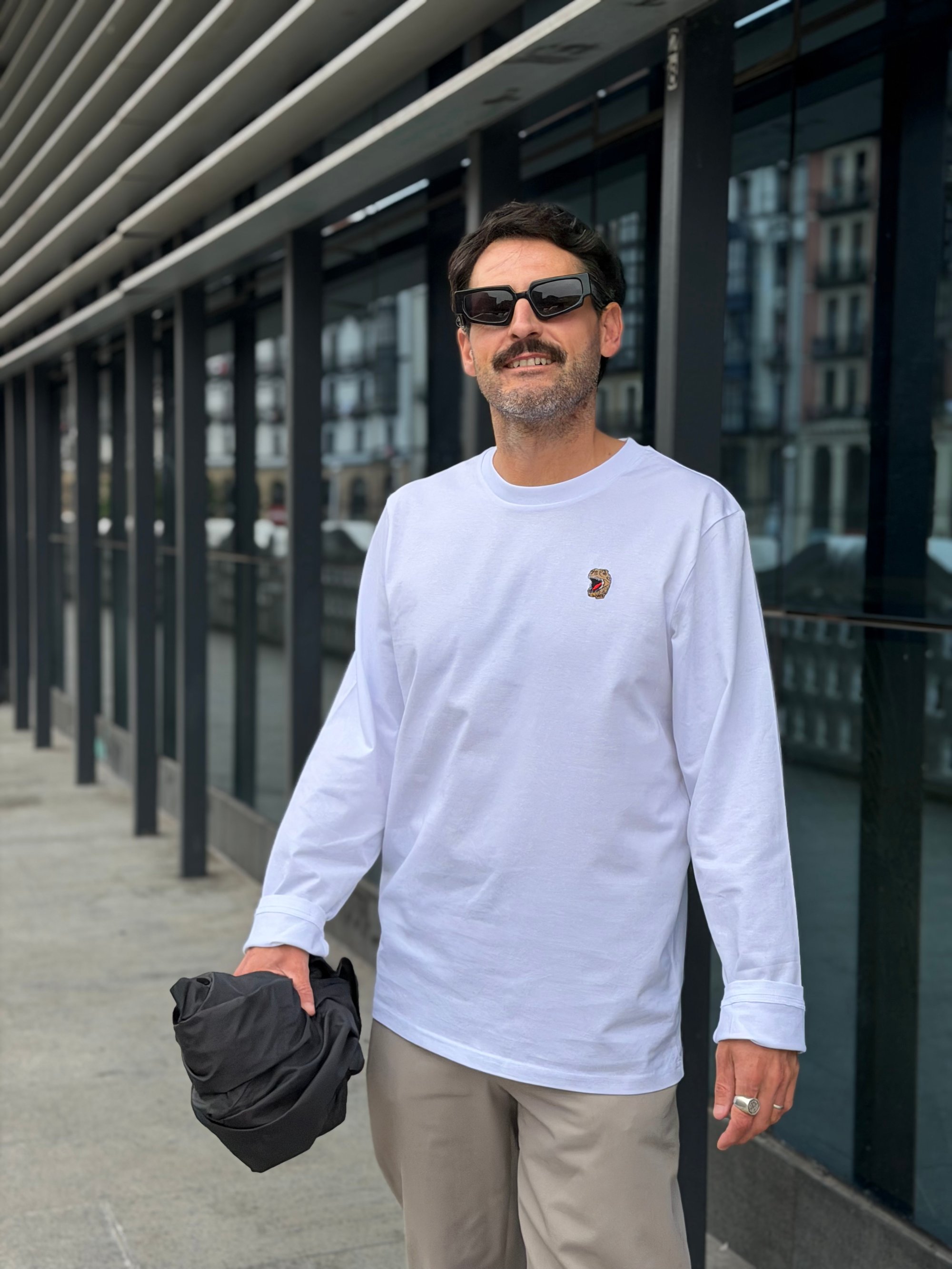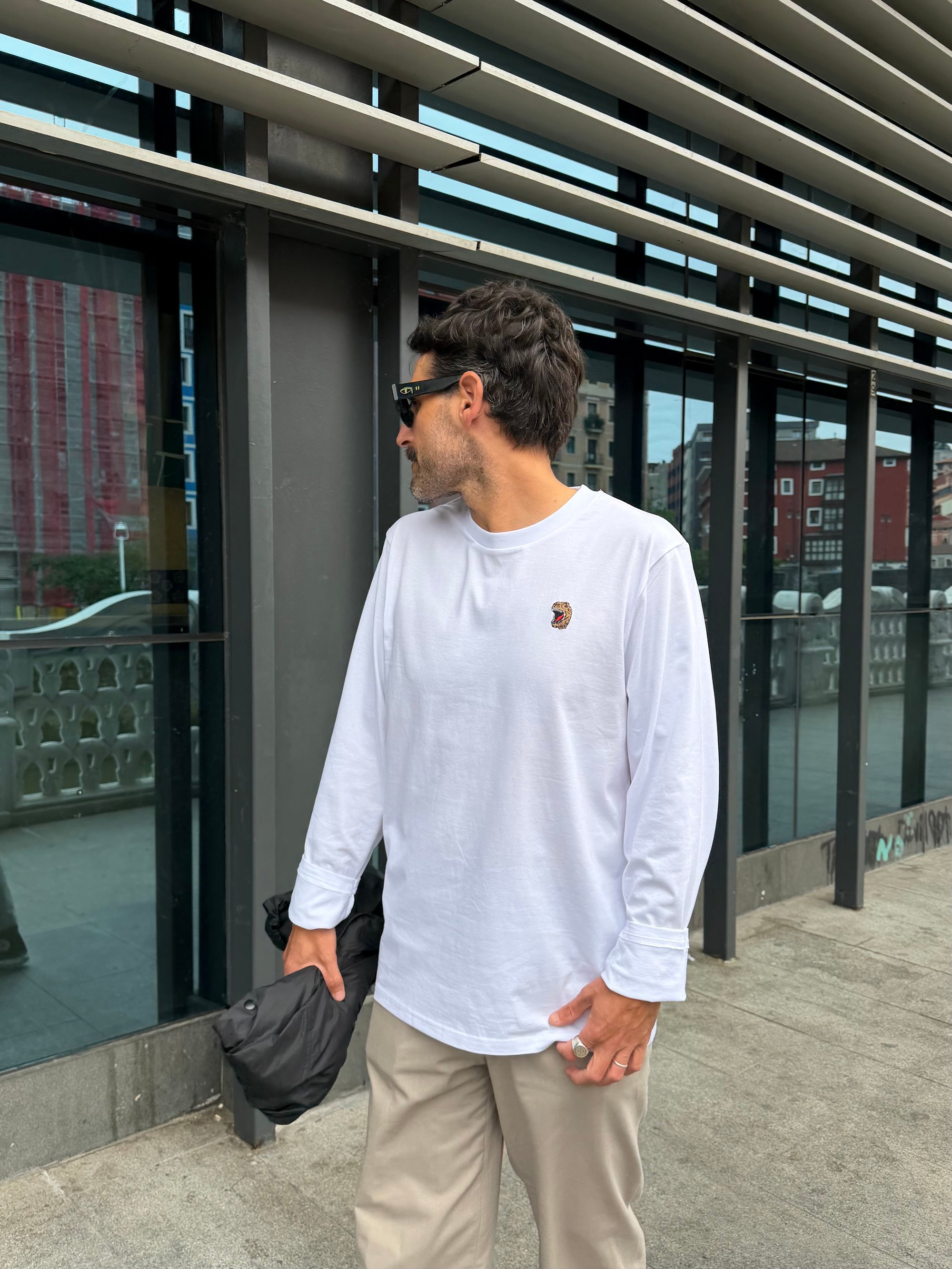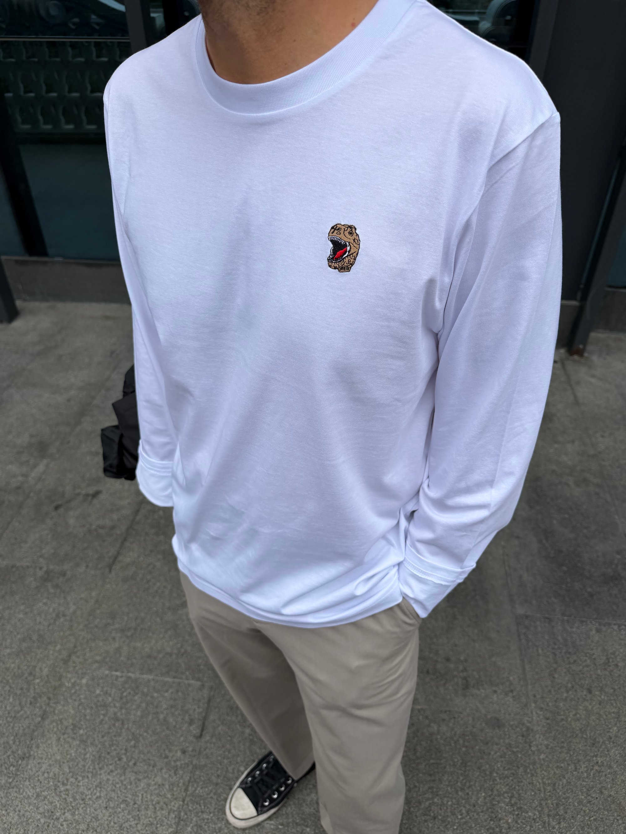 Camiseta manga blanca 100% algodón orgánico con detalle T-rex bordado en el pecho.